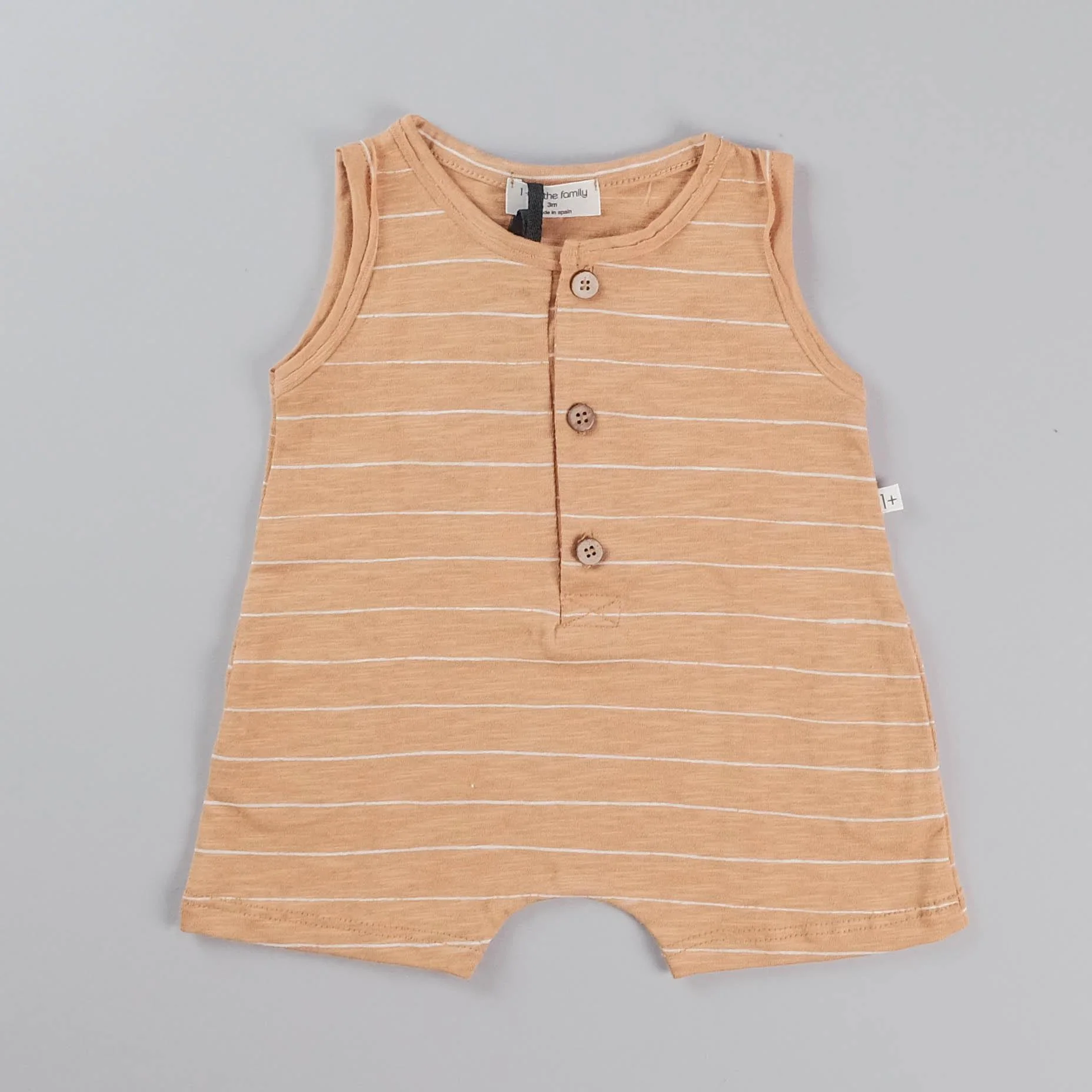 Pagliaccetto senza maniche con scollo tondo, apertura con bottoncini in legno, fantasia a righe.