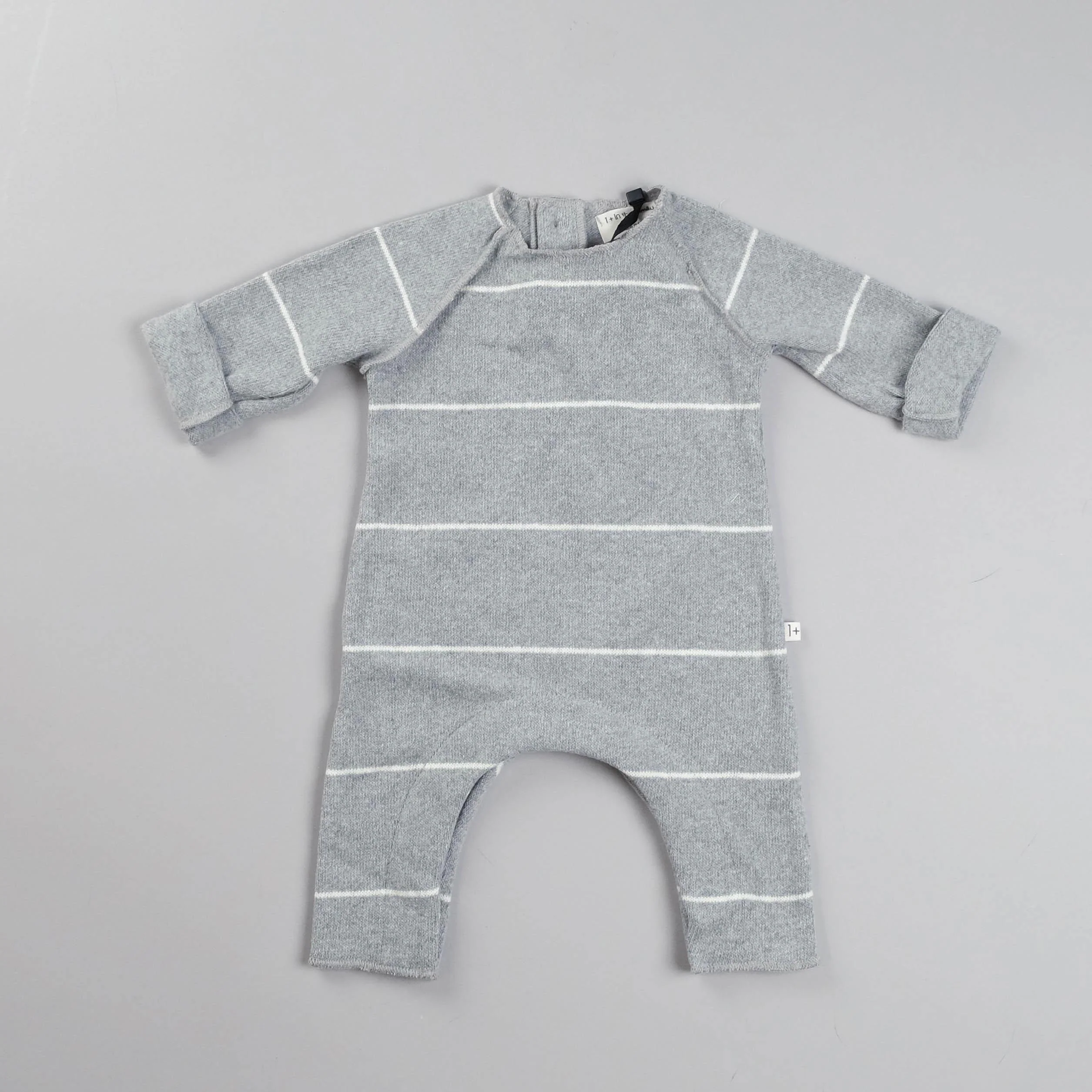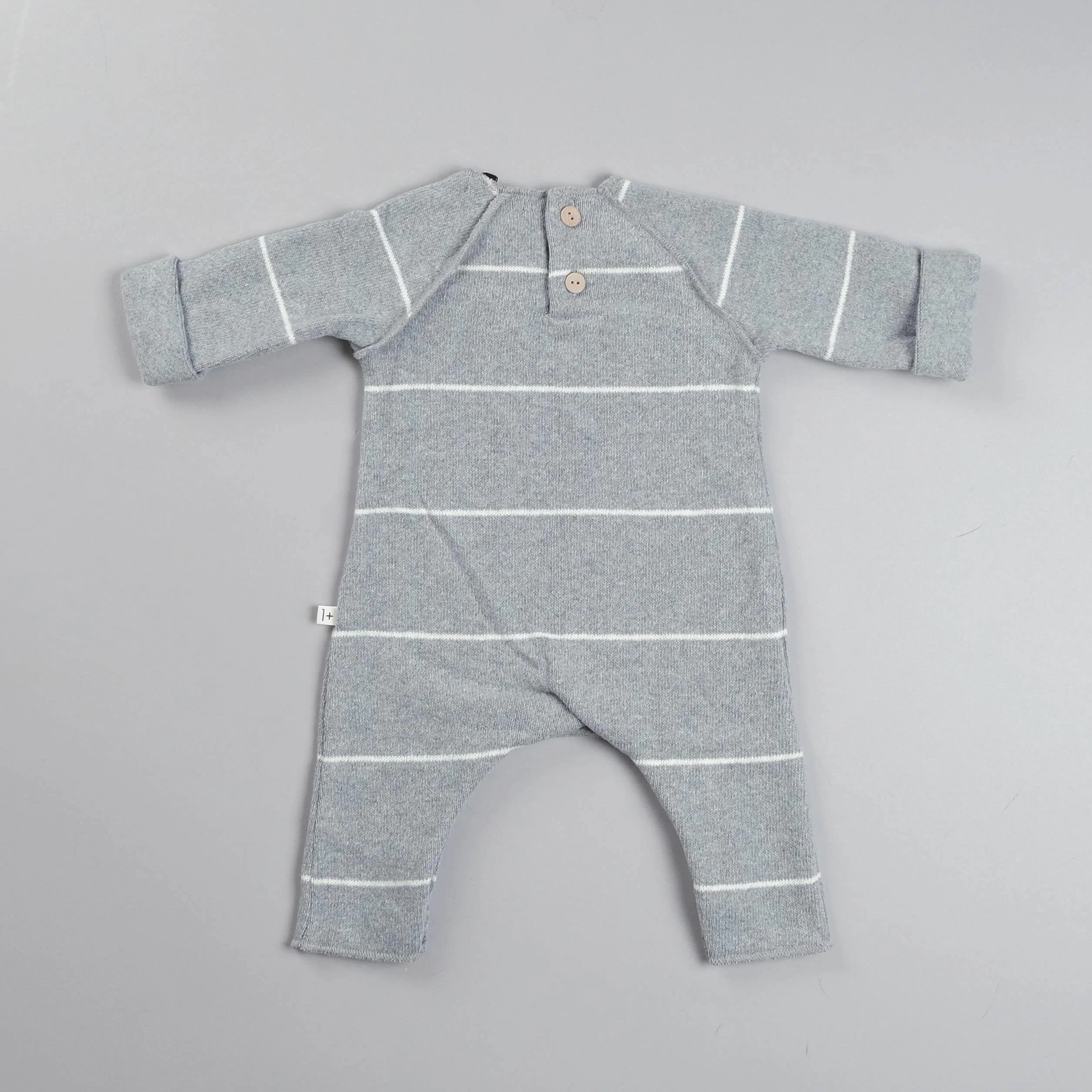 Tutina unisex con manica lunga in morbido e caldo tessuto a righine. Apertura sul fondo con bottoncini a pressione per il cambio pannolino e chiusura sul retro del collo con due bottoncini in legno. Risvolto a fondo manica, taglio dritto ed essenziale. Tessuto recycled yarn, un filato composto da cotone riciclato che ha un’attenzione in più per l’ambiente.