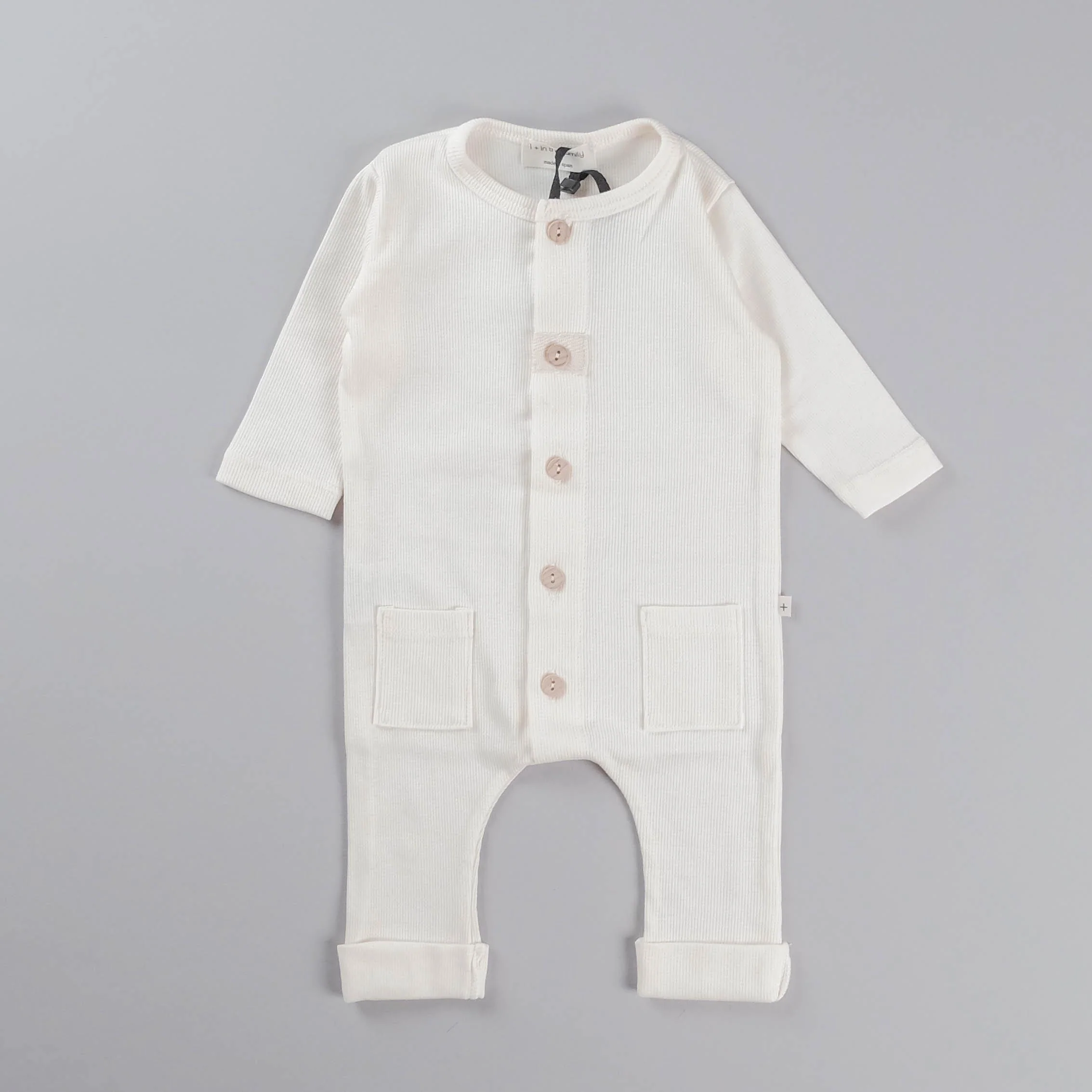 Tutina lunga in tessuto a costine, apertura sul fronte tramite bottoncini in legno.