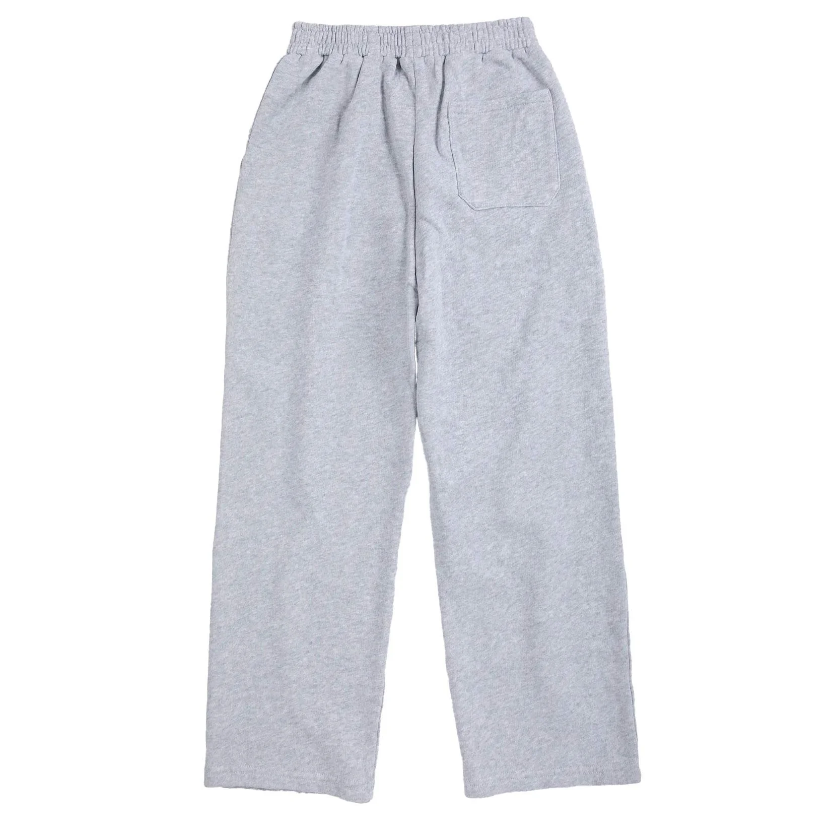 Heather grey pants. Designed with elasticated waistband, double pleat, embroidery, wide leg fit, adjustable drawstring, long length, patch pocket, seam pocket and fleece. Made in Portugal.