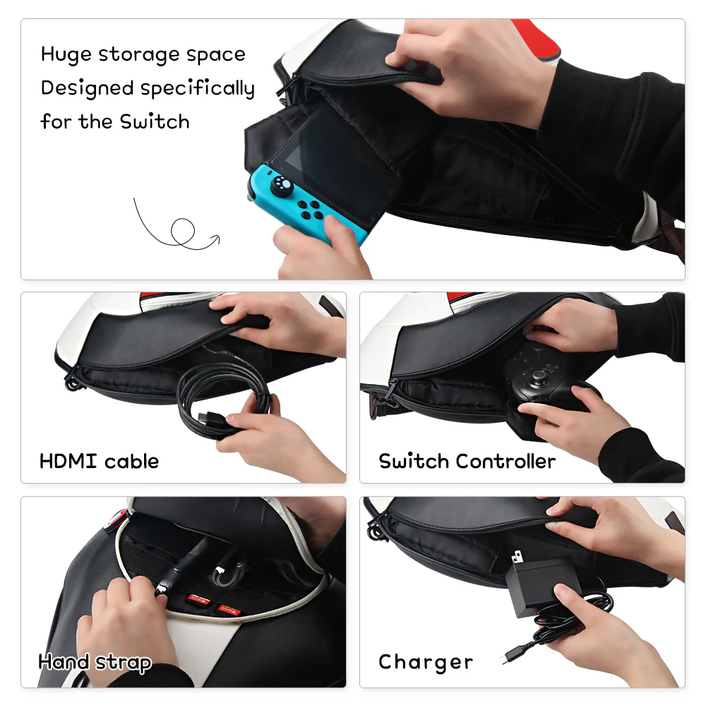 Elegante borsa a tracolla/zaino con design Pokeball, ideale per trasportare le console Nintendo Switch.
