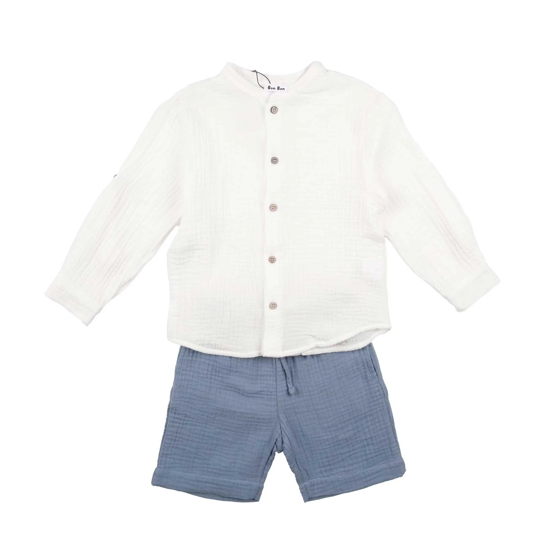 Completo due pezzi in mussola di cotone composto da camicia a manica lunga risvoltabile e colletto alla koreana, e bermuda con elasticoe coulisse in vita.