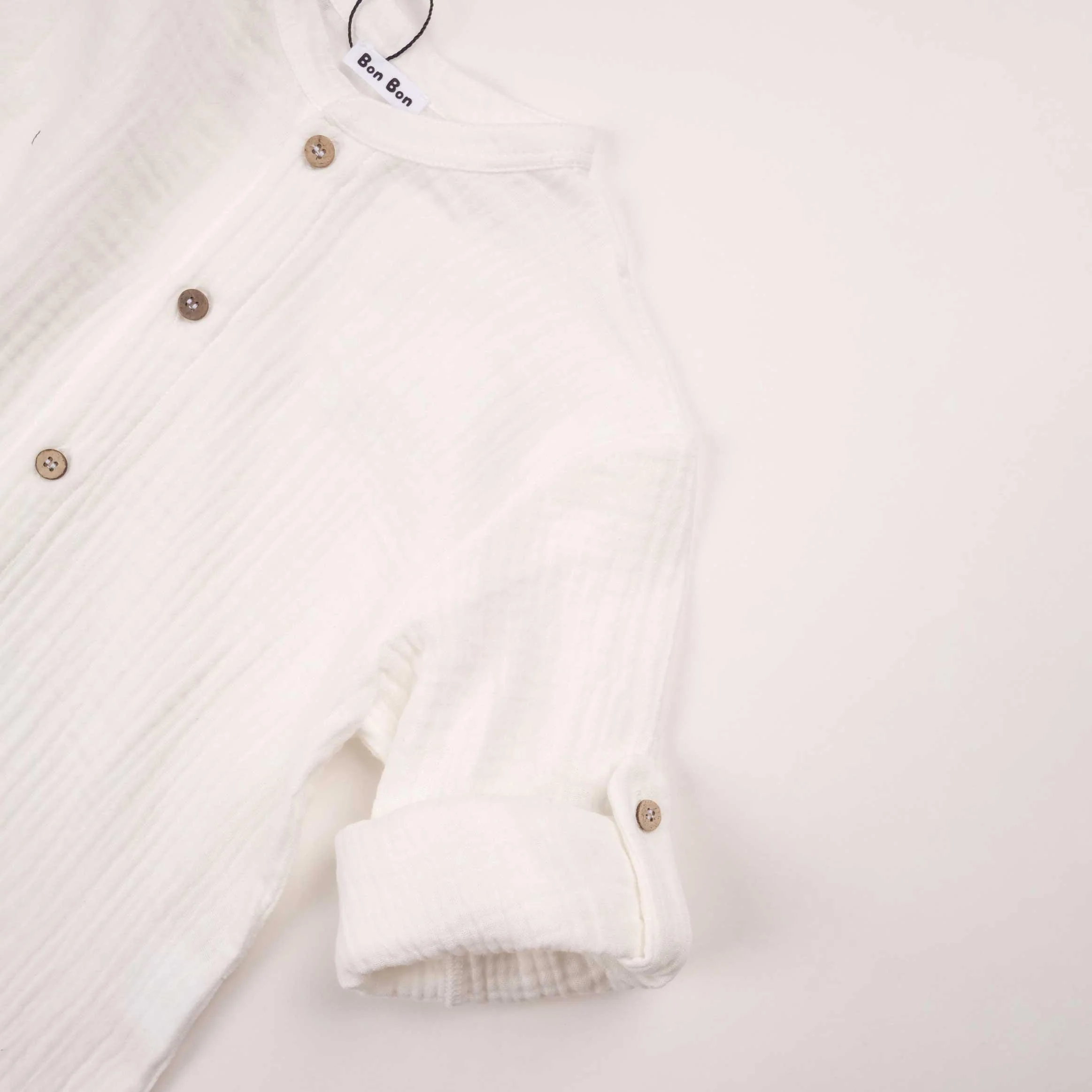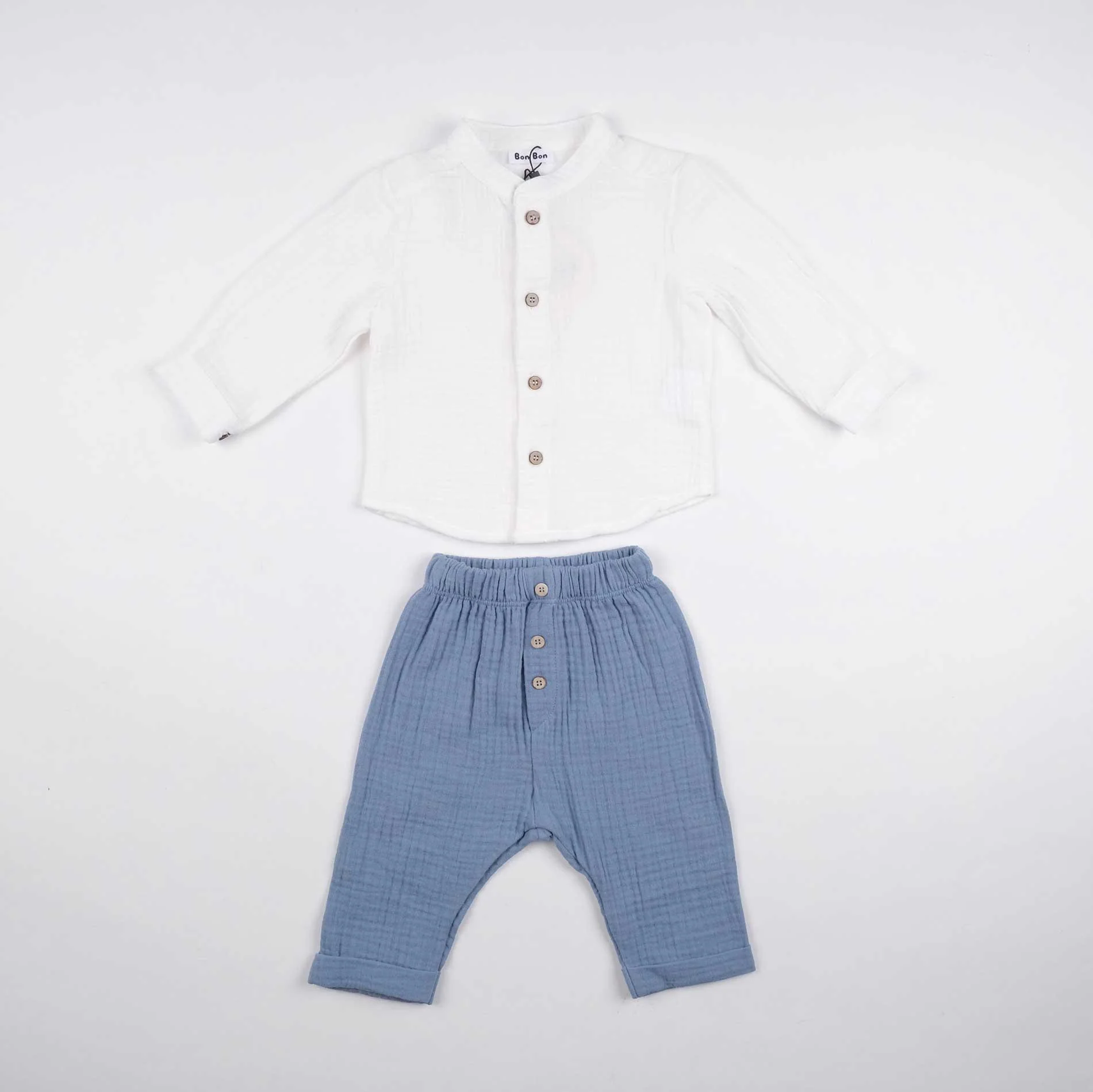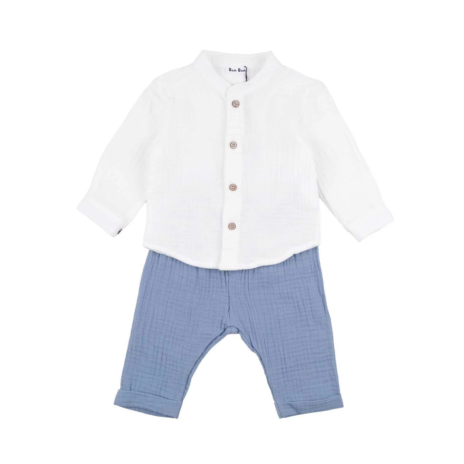 Completo due pezzi in mussola di cotone composto da camicia a manica lunga risvoltabile e colletto alla koreana, e pantalone con elastico e coulisse in vita.