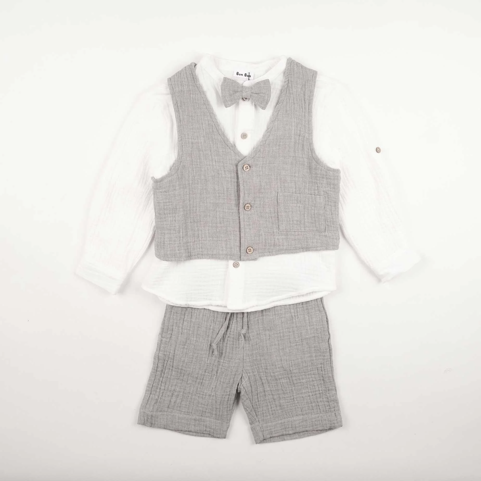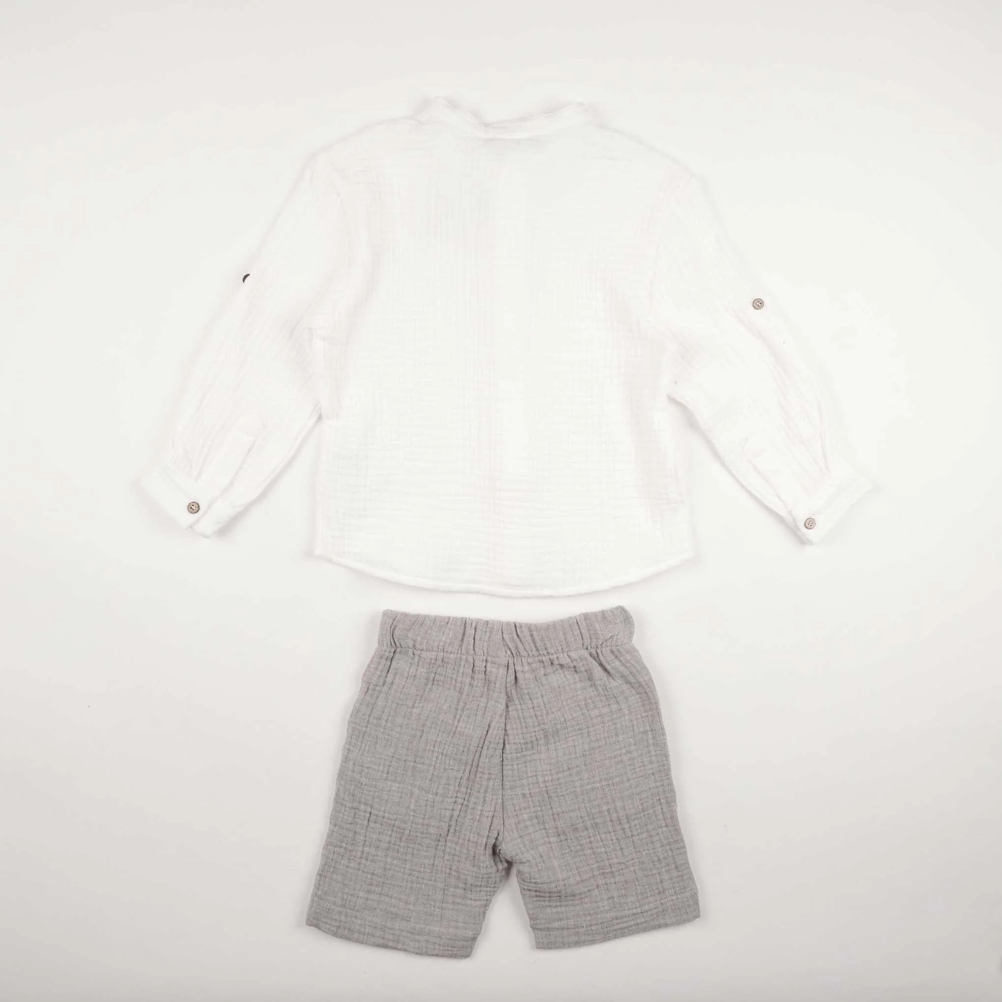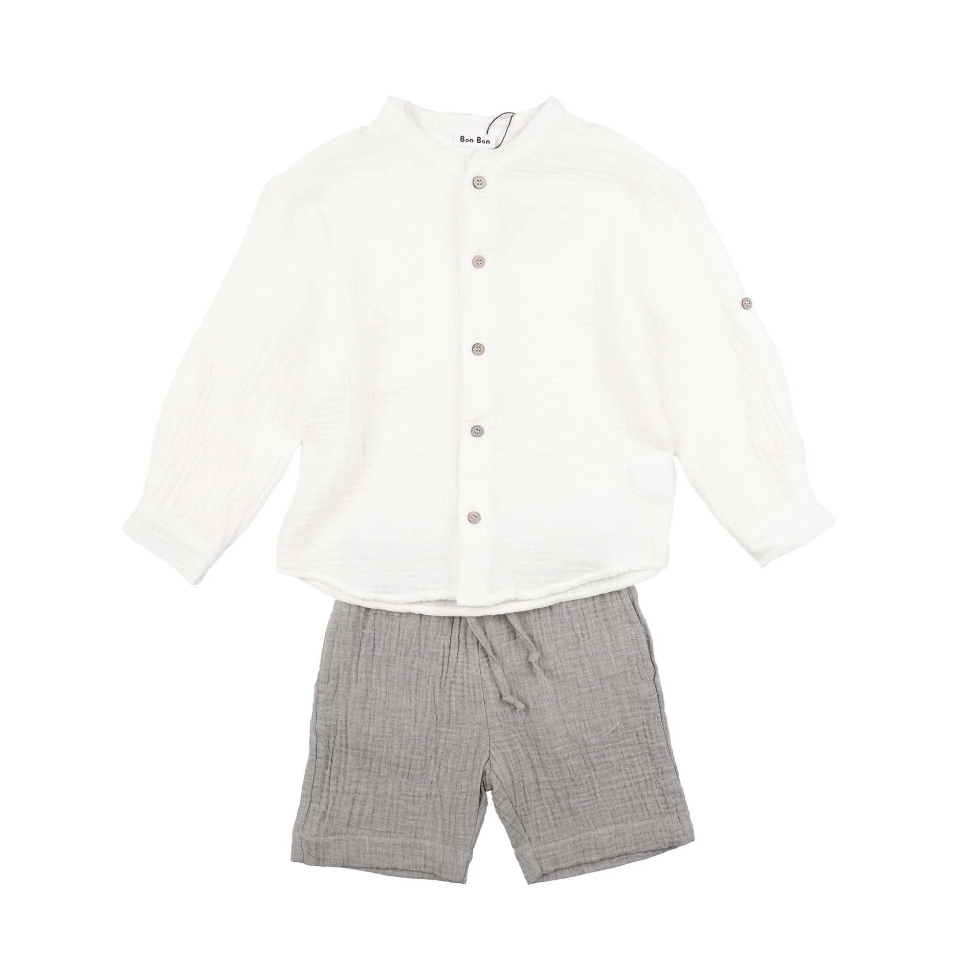 Completo due pezzi in mussola di cotone composto da camicia a manica lunga risvoltabile e colletto alla koreana, e bermuda con elasticoe coulisse in vita.