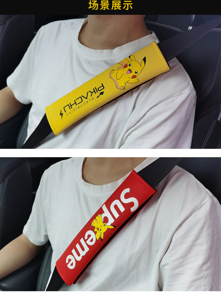 Queste cinture di sicurezza o copri cinture di sicurezza sono qualcosa per i veri fan dei Pokémon e sicuramente delizieranno i bambini sui sedili posteriori. Le copertine hanno il popolare Pokémon Pikachu stampato sul davanti. La cover è disponibile in quattro diverse versioni. In giallo con un Pikachu saltellante e in rosso con il Pikachu seduto al centro e il famoso emblema Supreme sullo sfondo. Le altre due protezioni per cintura sono nere con impronta Pikachu.