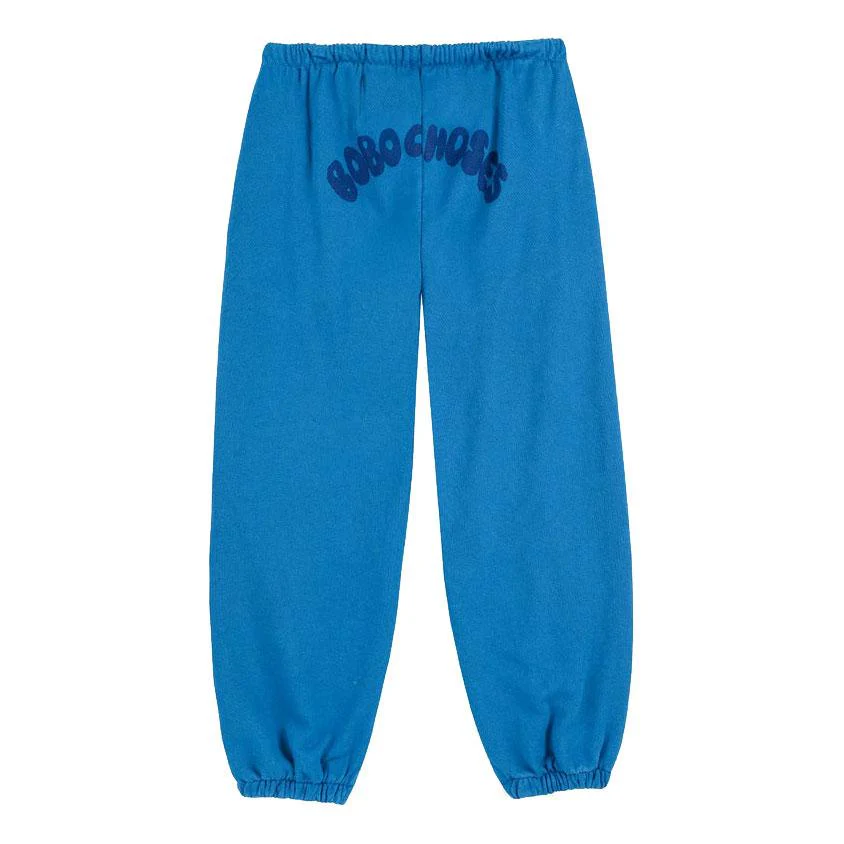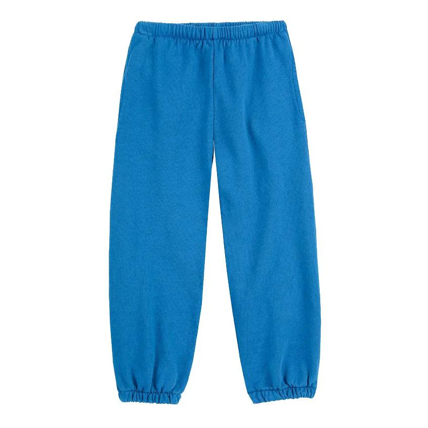 Blue pants. Designed with elasticated bottom, elasticated waistband, loose fit, adjustable drawstring, long length, seam pocket and inner brush fleece. Made in Portugal.