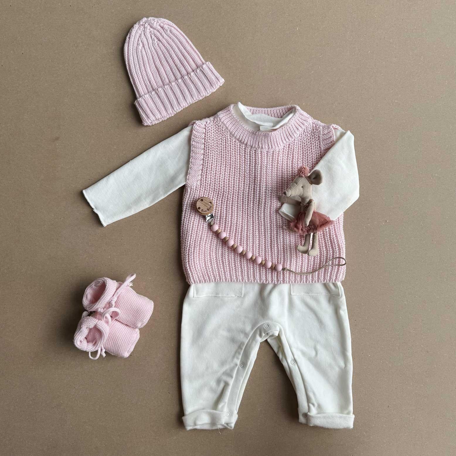 Gilet in maglia con vestibilità ampia. Da abbinare alle nostre tutine, cappelli e scarpine.