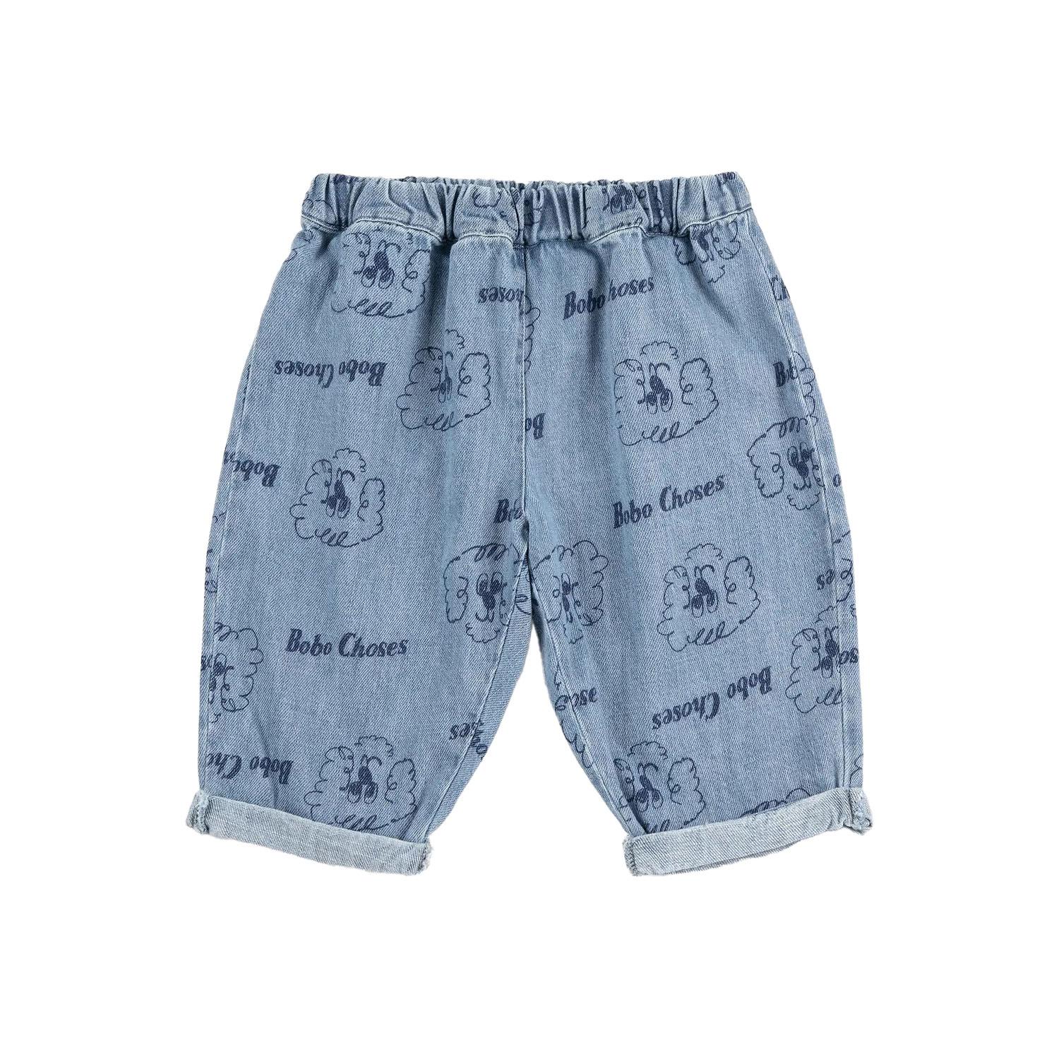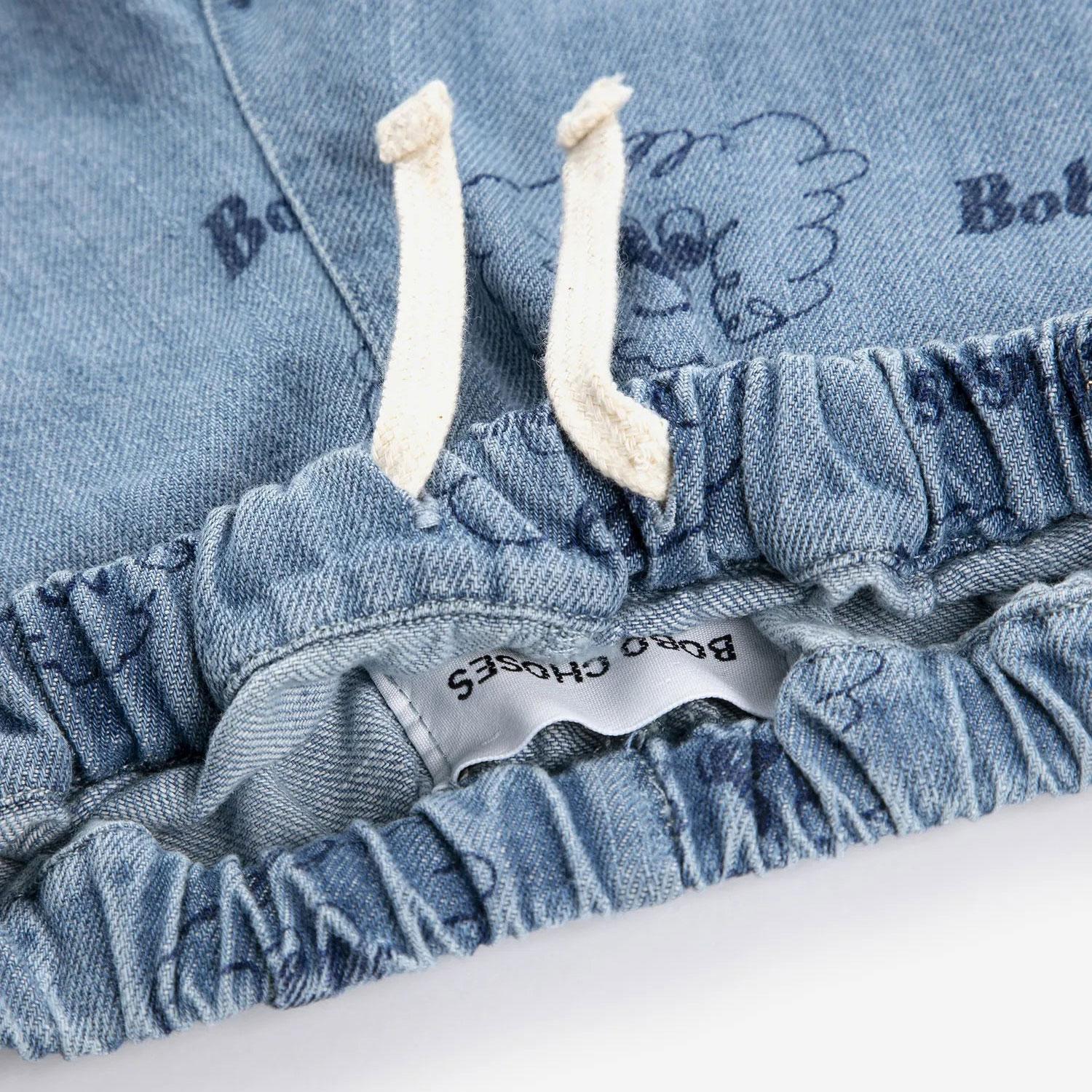 Prussian blue pants. Designed with elasticated waistband, embroidery, adjustable drawstring, ankle length, patch pocket, denim and relaxed fit. Made in Spain.