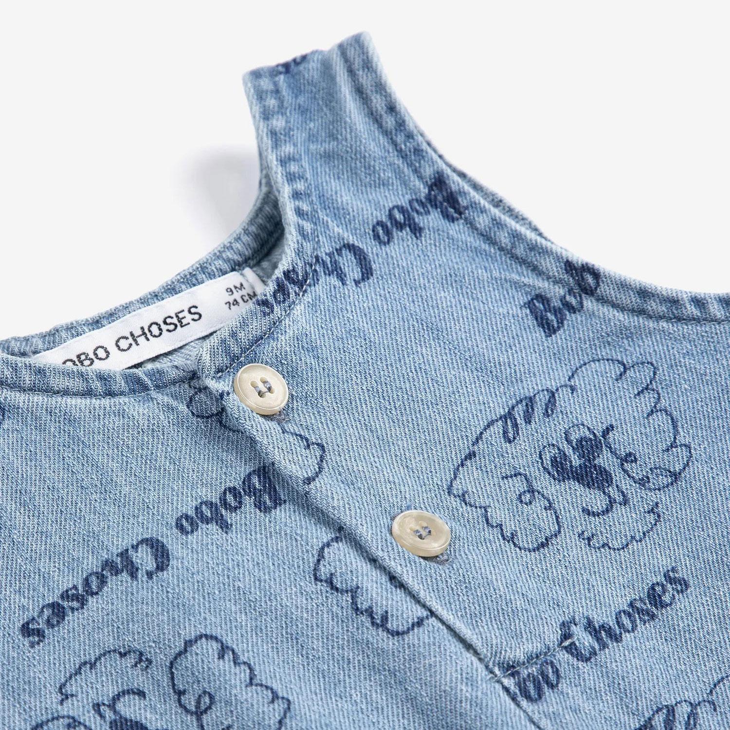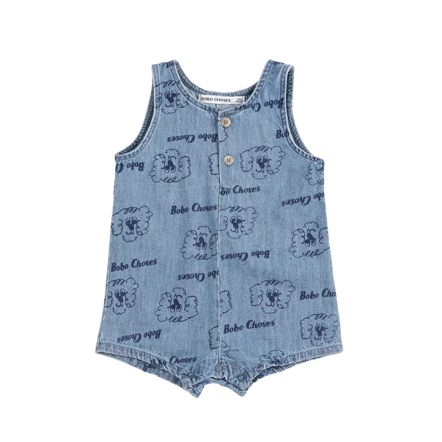 Light blue playsuit. Designed with sleeveless, front button fastening, crotch snap fastening, loose fit, over knee length, round neck and half placket. Made in Spain.