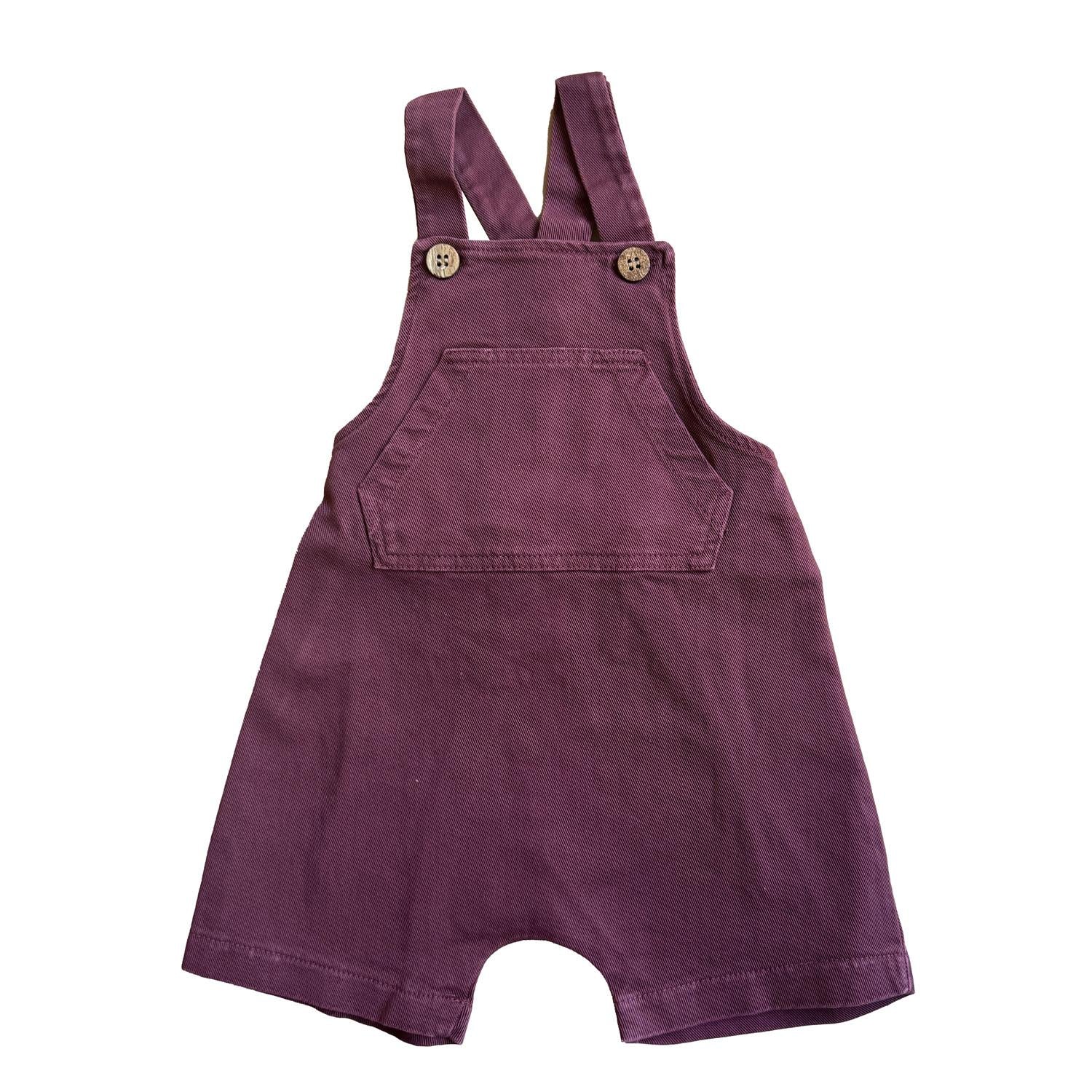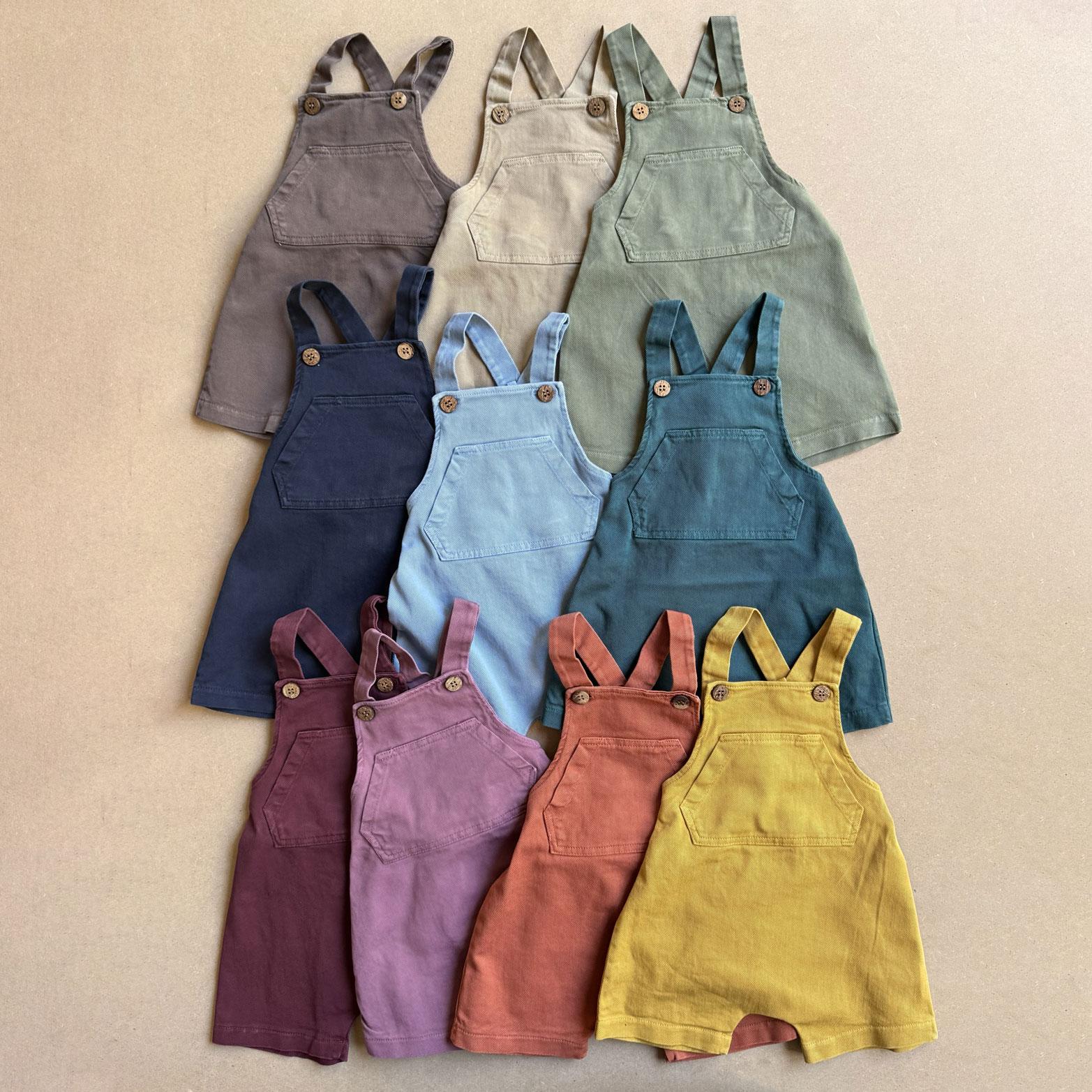 Salopette in denim, bottoncini in legno decorativi, elastico sulla schiena e maxi tasca sul fronte.