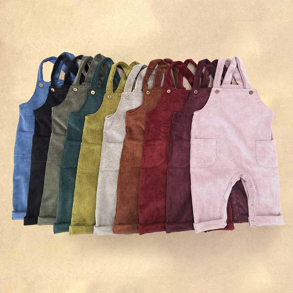 Salopette in velluto, bottoncini in legno e doppia tasca frontale. Disponibile in 10 colori diversi.