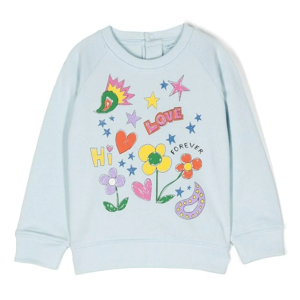 Felpa girocollo con stampa in cotone Supima azzurro, multicolore, stampa stile schizzo, chiusura con bottoni a pressione sul retro, girocollo, maniche lunghe raglan e orlo dritto.