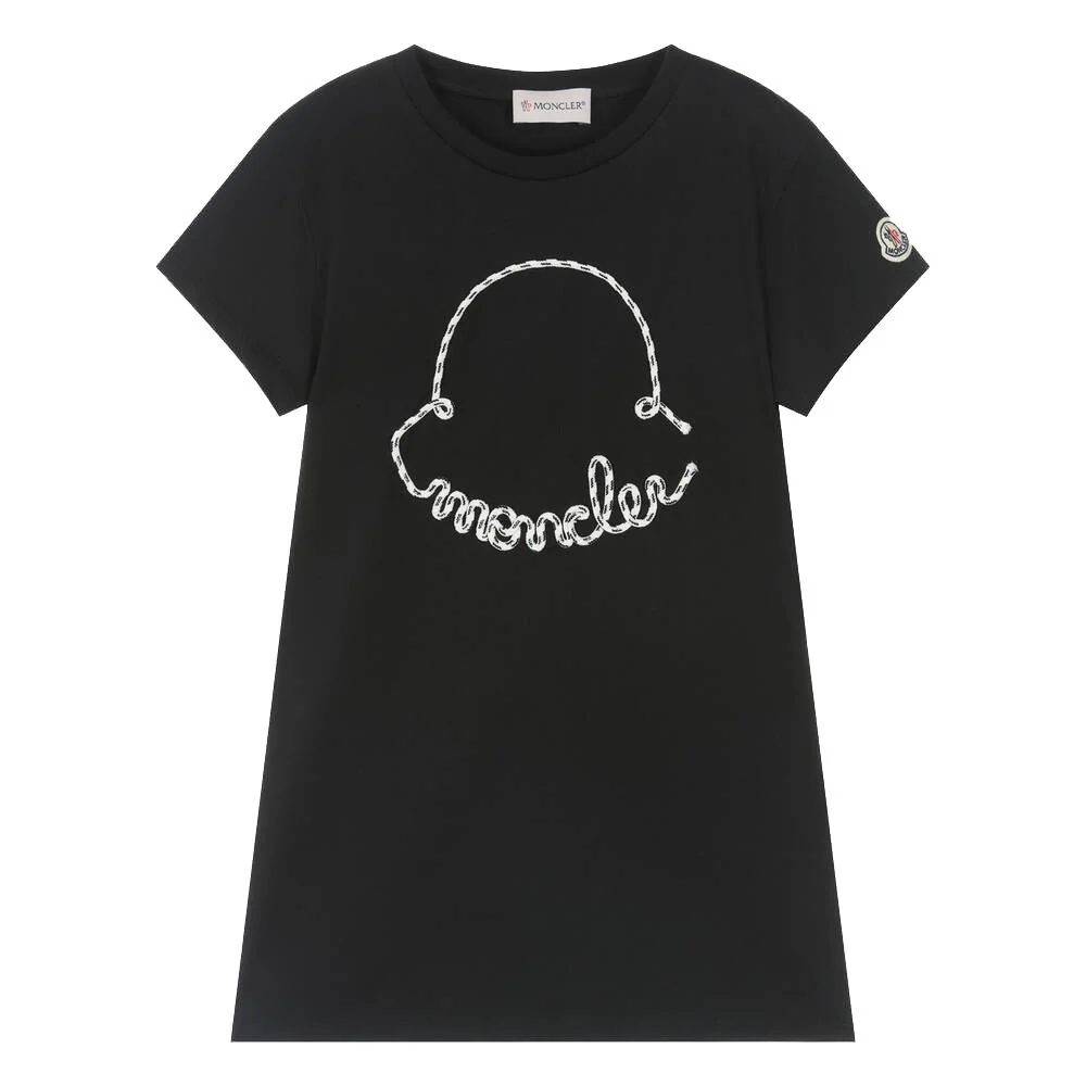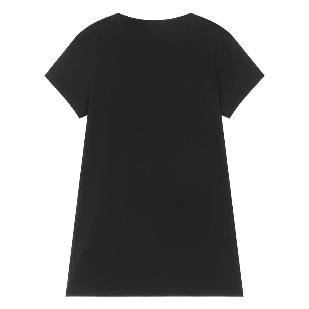 Vestito nero a manica corta, logo applicato sul fronte con lavorazione. Scollo tondo.