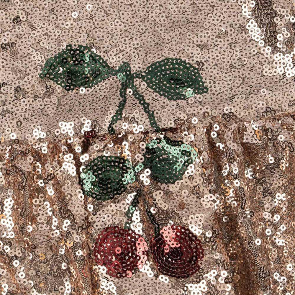 Incantevole abito con un brillante motivo di paillettes rosa. L’abito presenta una splendida fantasia a ciliegie nelle tonalità del rosso e del verde che si abbinano allo sfondo dorato. L’abito Konges Sløjd ha una struttura senza maniche e una scollatura rotonda.