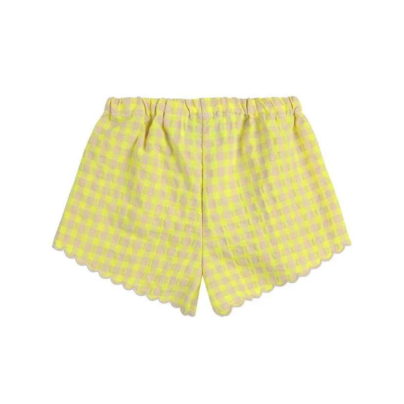 Bright and textured, these multicolor shorts are made for playful days. Made from 60% cotton and 40% recycled polyester, they feature a seersucker weave for a unique look. The elasticated waistband ensures comfort, while embroidery details add charm to the relaxed fit. Lovingly made in Spain with care for the planet.
