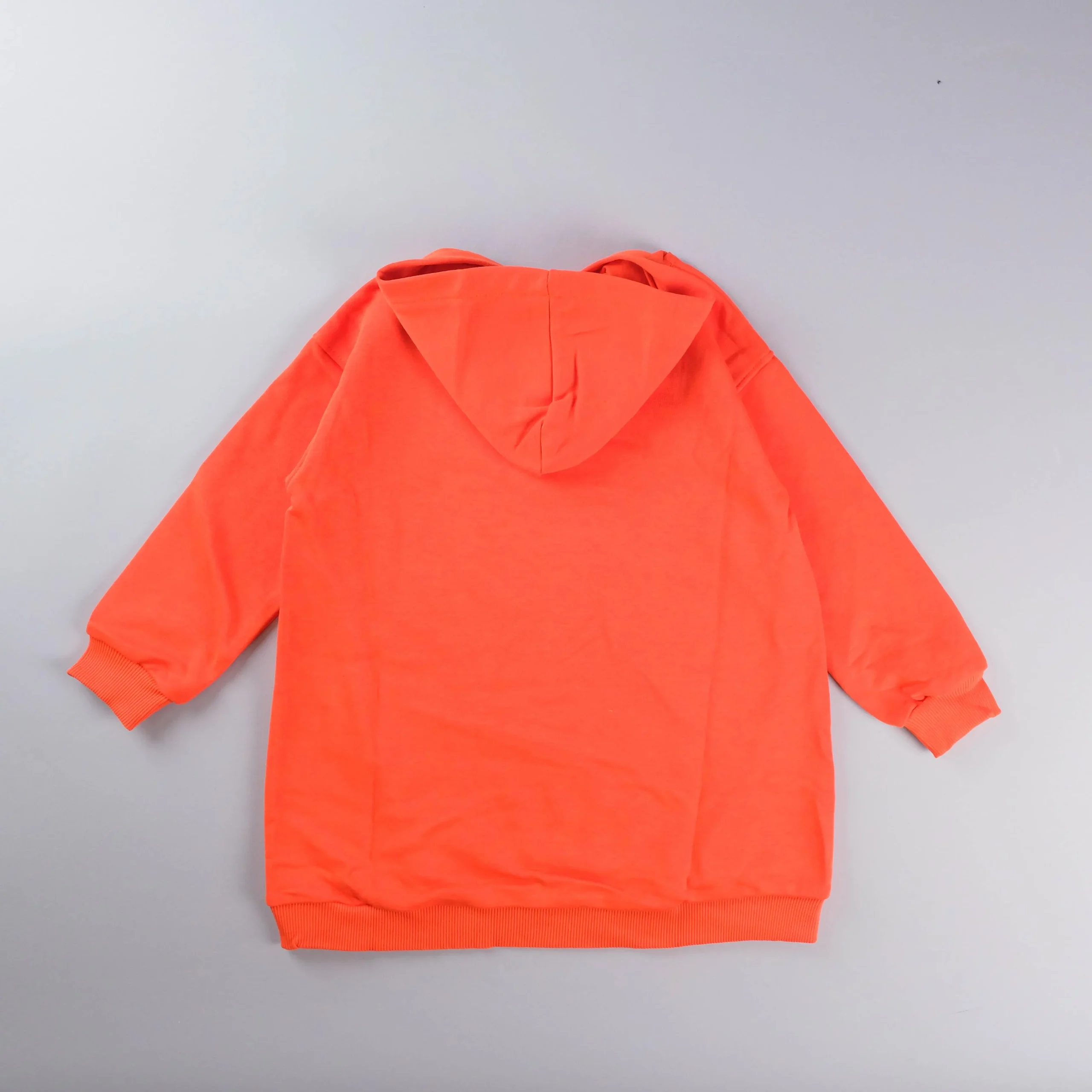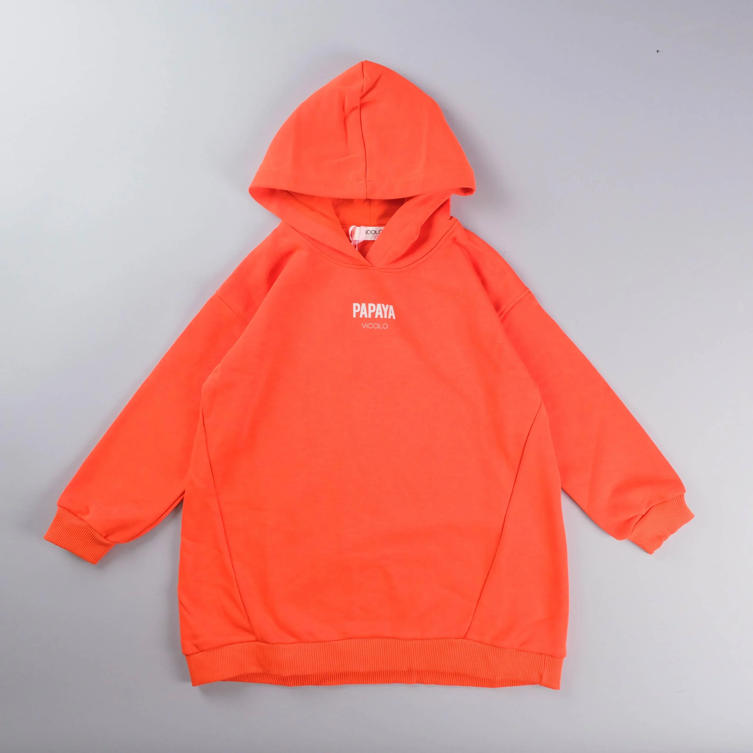 Vestito in felpa di cotone con cappuccio, taglio over, stampa frontale.